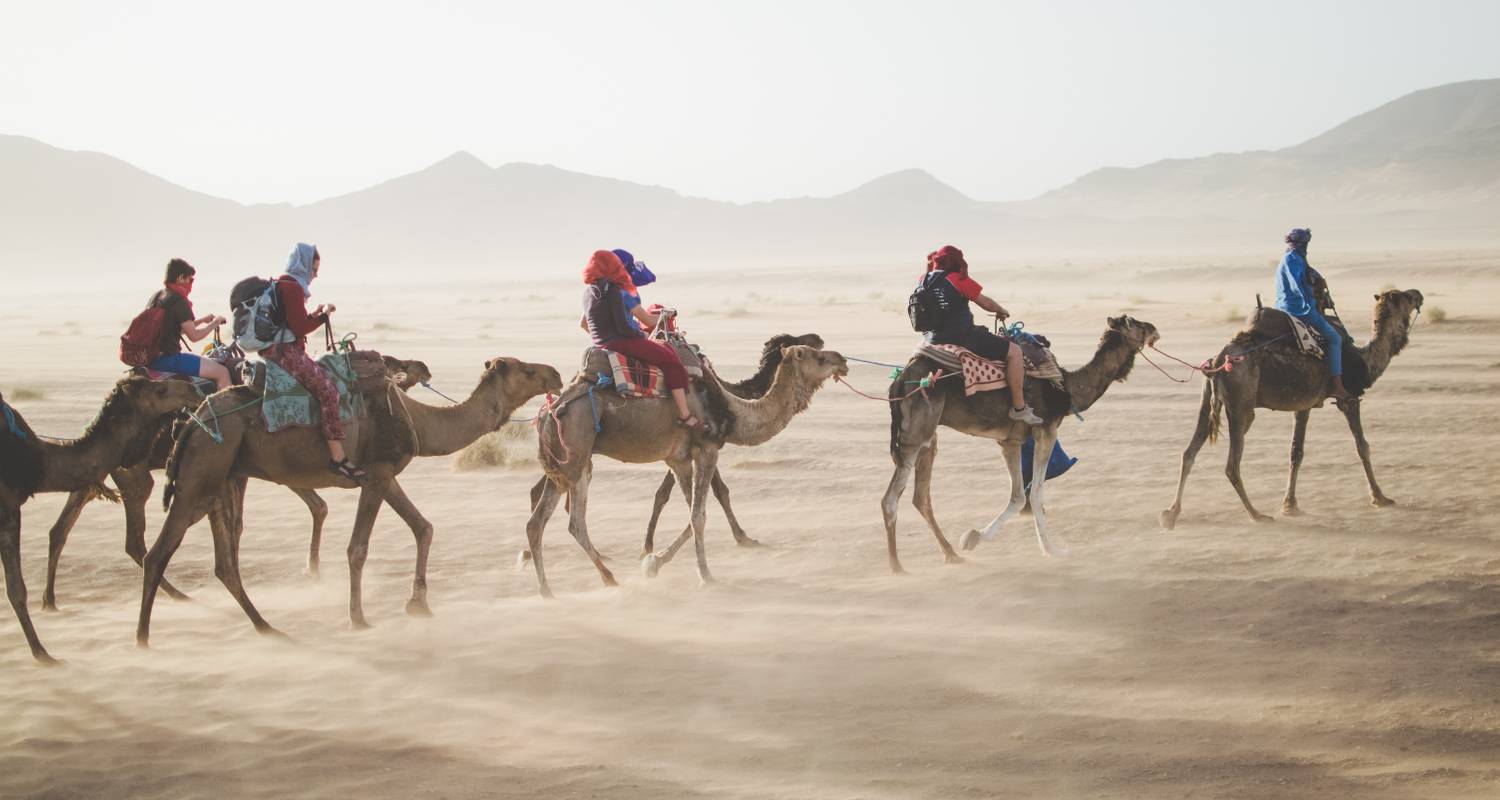 After breakfast we drive towards Todra Valley to visit the spectacular Todra Gorges – a series of limestone canyons with rock faces towering over 500 feet. Then we drive to the charming oasis town of Erfoud, where you can have lunch. After lunch we drive to Merzouga, known as the gateway to Morocco’s Sahara Desert. We make a short stop in a hotel by the dunes for refreshment, in two hour bfore sunset we go for camel trek into the dunes, observing mesmerizing desert landscapes before arriving at our camp at around 6 p.m. We drink traditional mint tea with the nomads then travel over the rippling sands to watch the amazing sun-set. Back at the camp we have dinner, after which the nomads play music around the fire until we retire for the night in tents underneath the stars. Overnight camping in Merzouga. Breakfast and dinner included.