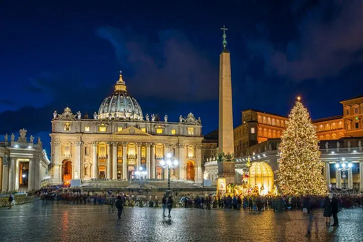 Before the Midnight Mass, enjoy a delightful appetizer-style meal near St. Peter’s, setting the stage for the evening’s spiritual celebration. We’ll then visit the iconic Vatican Christmas tree and Nativity scene, a breathtaking display of festive tradition.