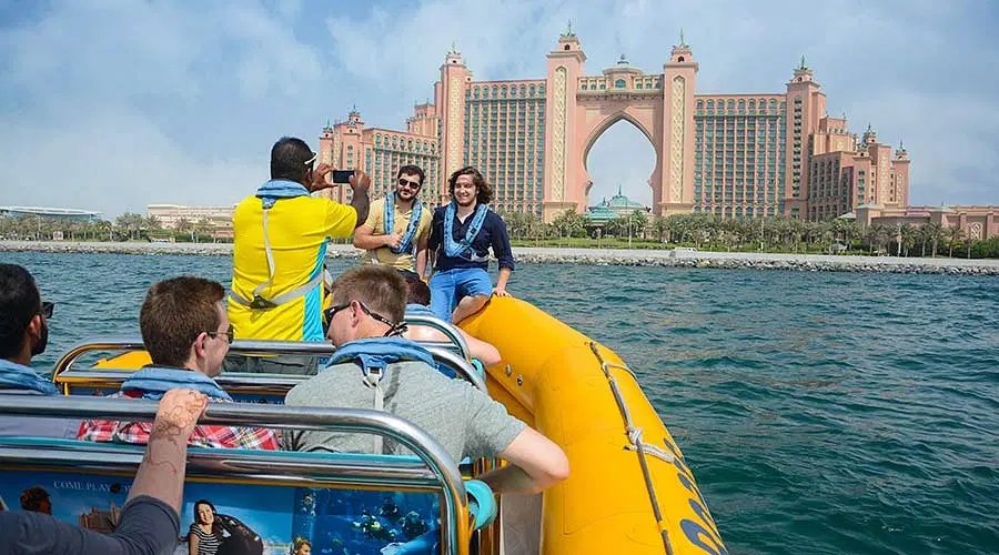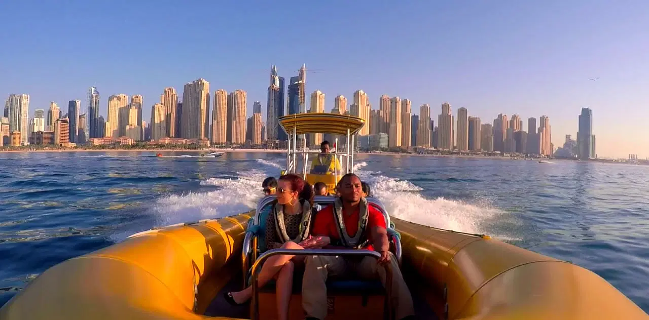 Feel the thrill as your high-speed Yellow Boat cruises through the heart of Dubai Marina, showcasing its impressive skyscrapers and luxury yachts. Glide past the lively beachfront community of Jumeirah Beach Residence (JBR), where residential towers meet a vibrant leisure scene. Get up-close views of Bluewaters Island, home to the majestic Ain Dubai – the world’s largest observation wheel. You might even catch a glimpse of the daring skydivers at Skydive Dubai, adding an extra touch of adventure to your scenic tour.