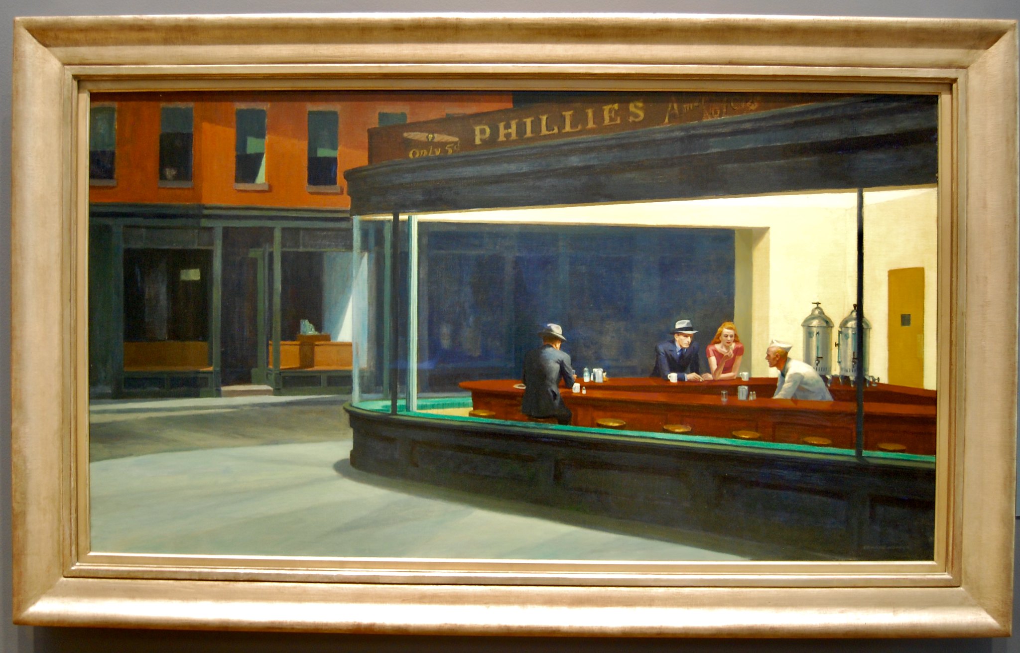 📌 Spot the details! Notice how there are no doors leading into the diner? This enhances the sense of isolation in the painting.