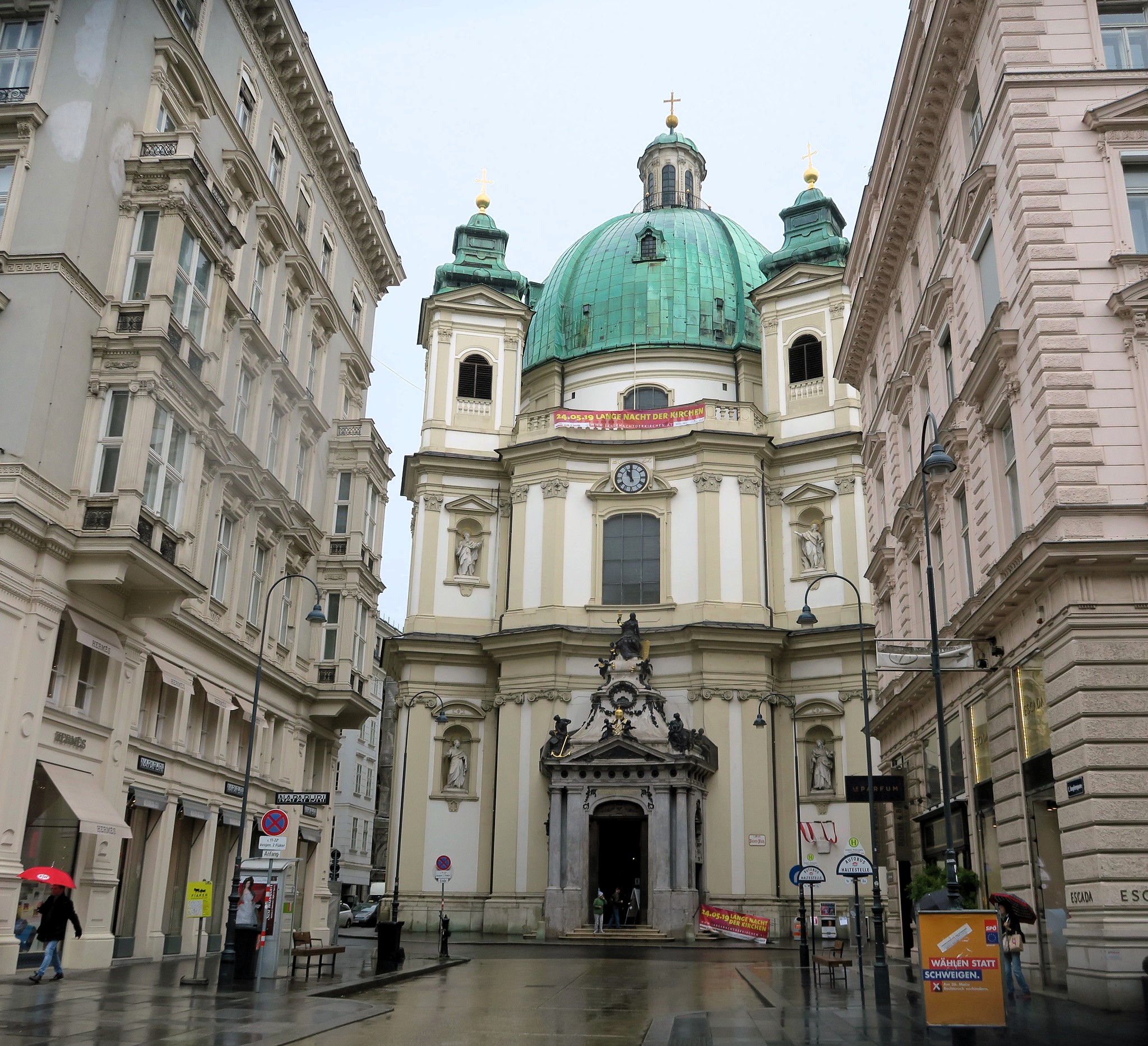 Oryginał Kościół Św. Piotra została założona w IV wiek, co czyni go jednym z Najstarsze miejsca kultu w Wiedniu. Obecna budowla barokowa, ukończona w r 1733, został zaprojektowany przez Johanna Lukasa von Hildebrandta, czerpiąc inspirację z Bazylika Świętego Piotra w Watykanie. Dziś jest jednym z wiedeńskich najwspanialszych kościołów, przyciągając gości z całego świata.
