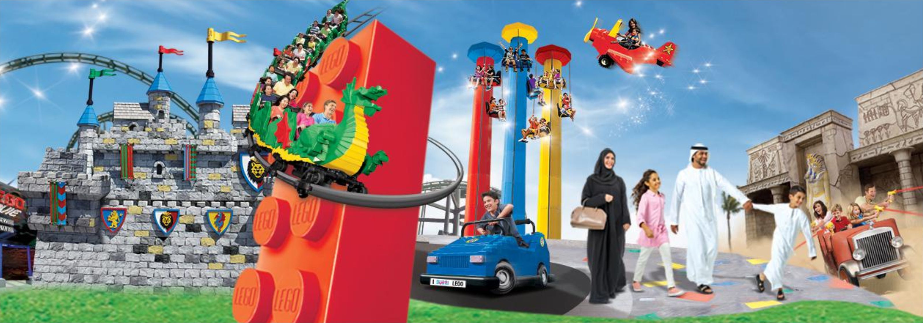 At “KINGDOMS” save the day in this medieval land. Conquer the Dragon on an exhilarating roller coaster ride through the King’s castle while younger knights and princesses can also ride the Dragon’s apprentice. Merlin has cast his spell on you. pedal your way up and down on Merlin’s Flying machines to break the spell. In ADVENTURE island young explorers who seeking an adventure will find just that in this land. Join the LEGO divers in a captivating underwater adventure that the whole family can experience. At last a visit to MINILAND is an absolute must for every family, with 20 million LEGO bricks all in this indoor, air conditioned interactive area. LEGOLAND Dubai feature Dubai’s iconic skyline and key landmarks from around the middle east and you can have the opportunity to create your own skyline at Build A City, a 10 meter play table with LEGO bricks.