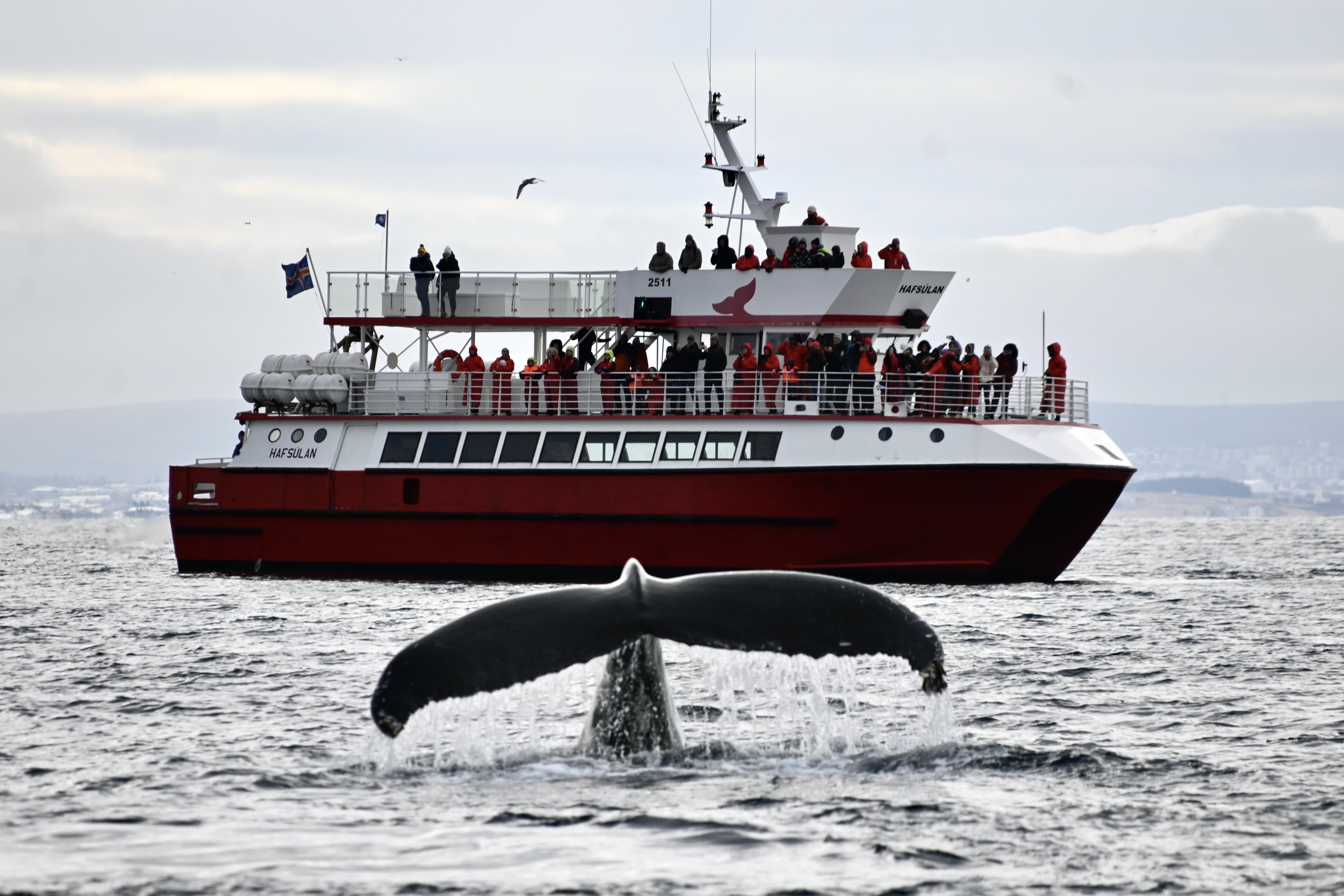 Drive yourself to Reykjavík's Old Harbour for the whale watching tour. You are likely to encounter minke whales, dolphins, porpoises and even Humpback whales on the cruise! After exploring the wonders of the whales and seabirds Faxaflói bay offers you return to the harbour approximately 3 hrs. later.