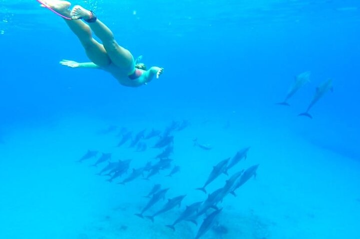 Experience the thrill of swimming with dolphins in their natural habitat on this unforgettable boat tour in Hurghada.