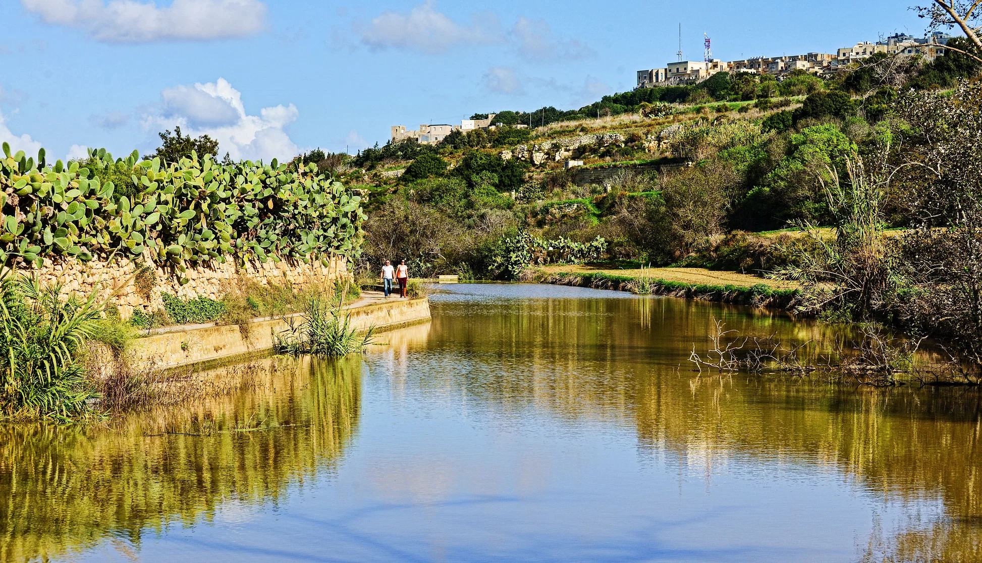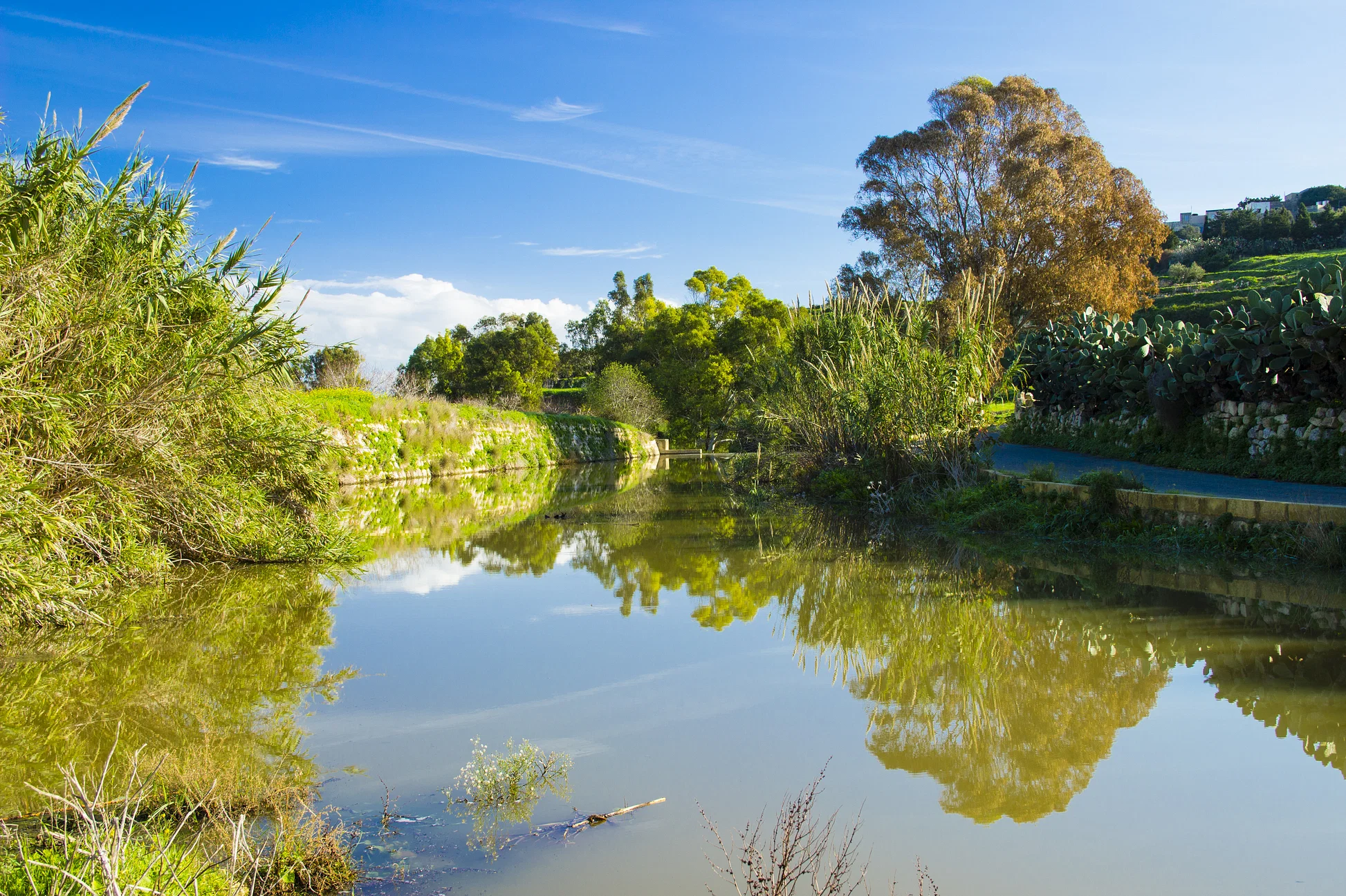 Your walking adventure begins at the tranquil Chadwick Lakes, an artificial water system created in the 19th century. This restored valley, Wied il-Qlejgħa, is a haven for birds, butterflies, and the endemic Maltese painted frog. You’ll wander alongside clear streams, wetlands, and riparian trees, surrounded by floating wildflowers and aquatic life.