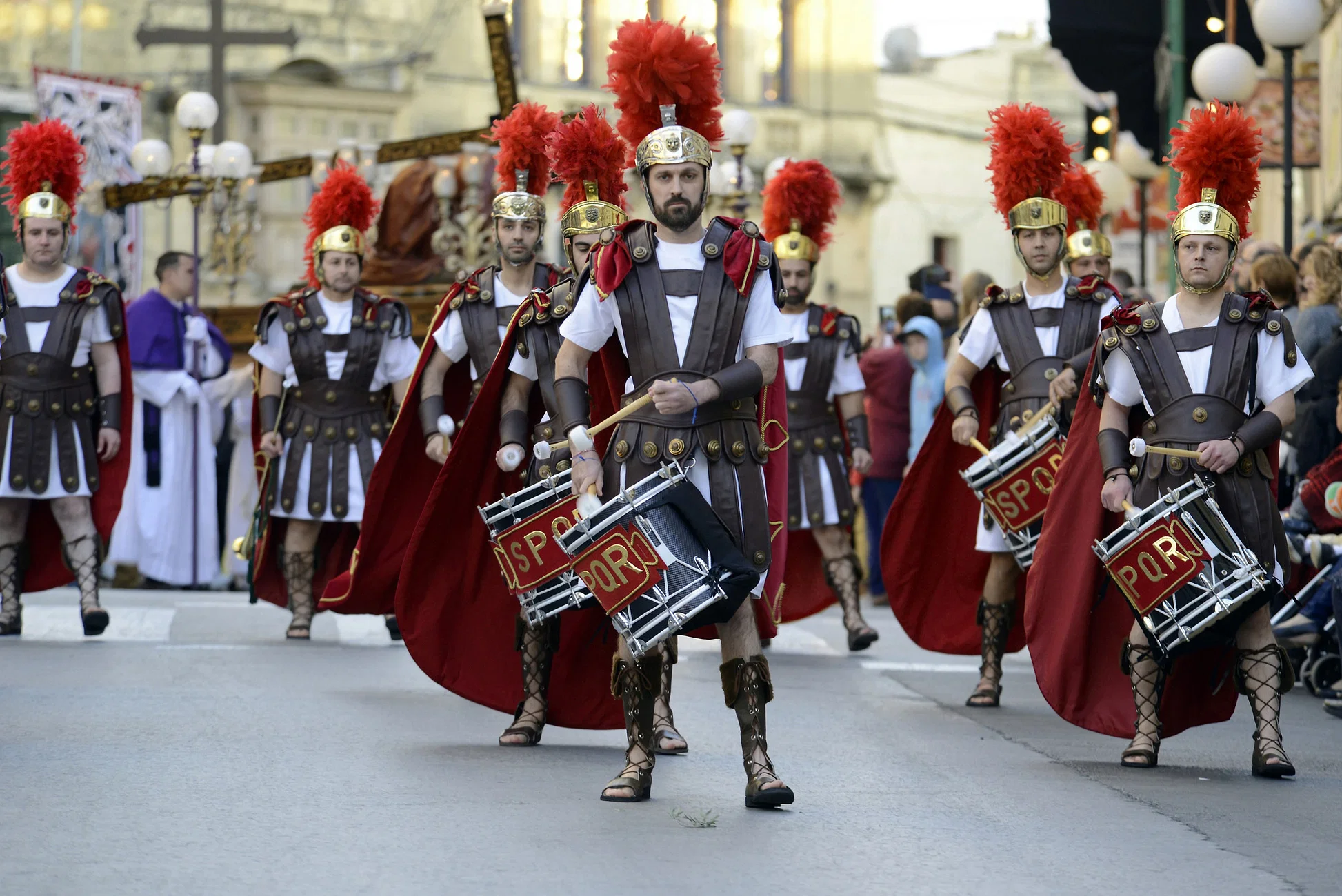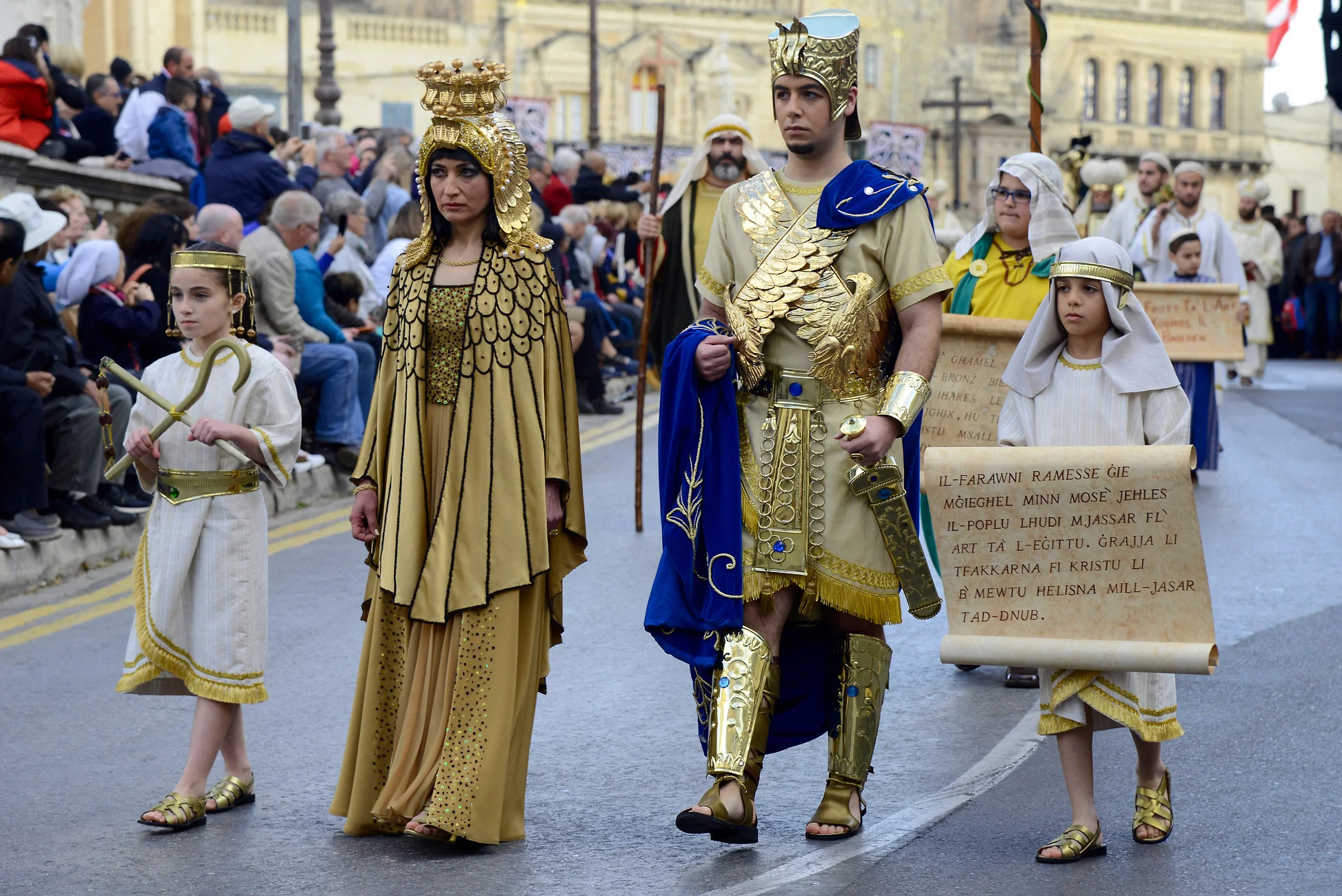 • Locals dressed as biblical figures (soldiers, disciples, Mary)