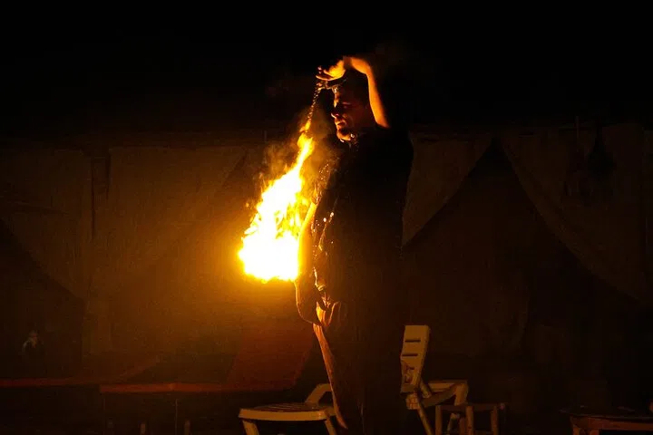 The Night Show The evening reaches its peak with the rhythmic beats of Berber drums. Watch the darkness come alive with a professional fire show, a magical conclusion to your desert adventure.