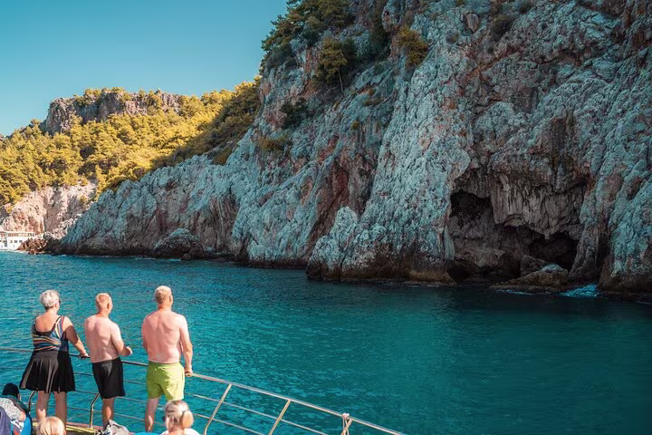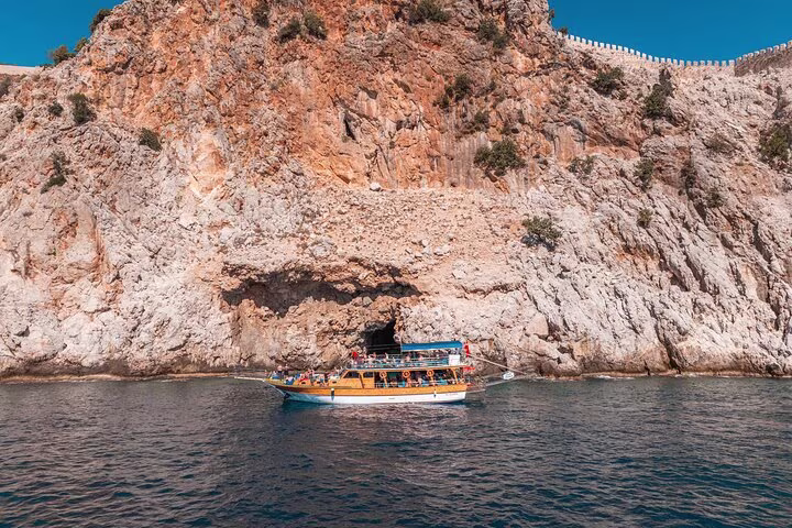 • Legendary Sea Cave Exploration: Sail past Alanya’s mystical coastal wonders. We’ll navigate close to the Pirates’ Cave, Lovers’ Cave, and the glowing Phosphorus Cave, where you can capture incredible photos of the rugged limestone cliffs.