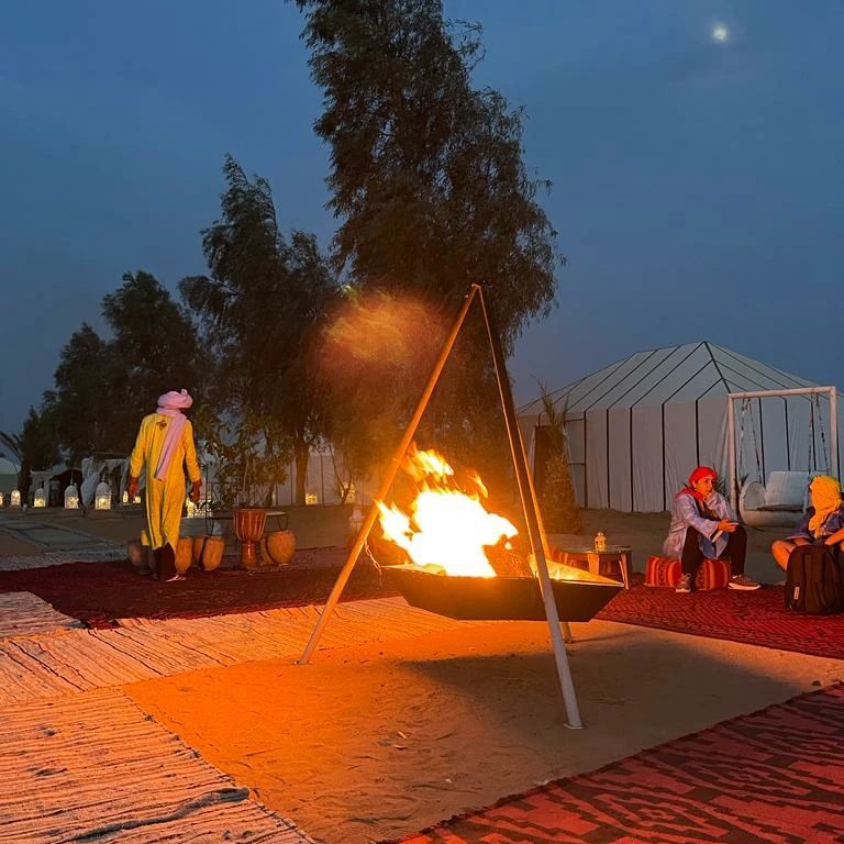 Savor a delicious Moroccan dinner featuring tagine, couscous, and fresh fruit. Afterward, gather around the campfire for live Berber music and drumming, immersing yourself in the rhythms of the desert.