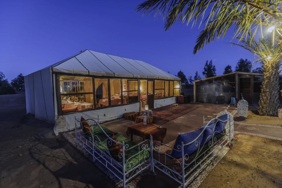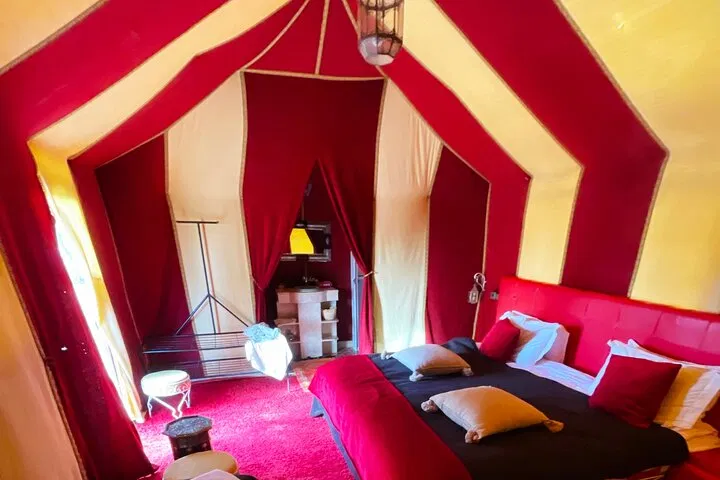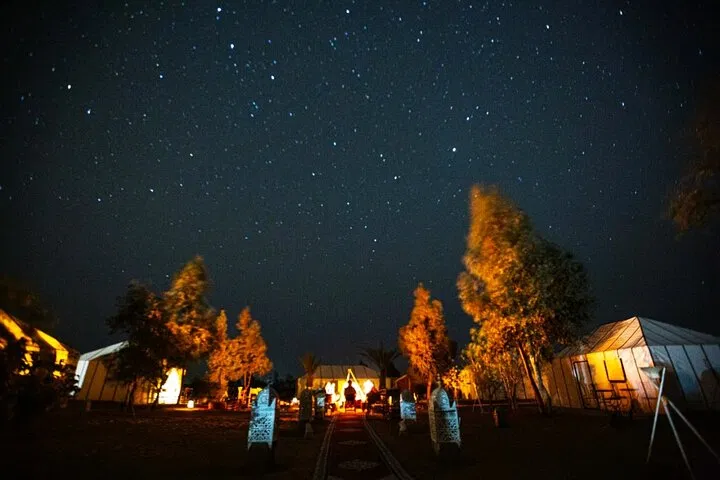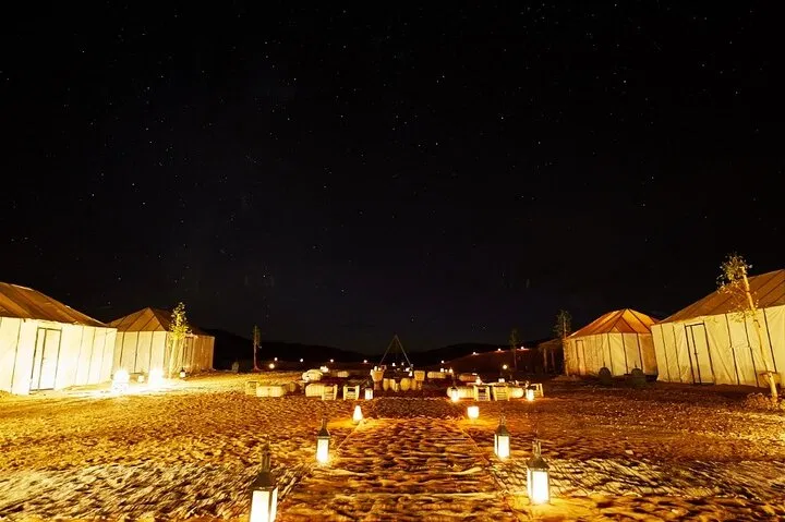 Traditional Berber Camp Experience: Spend the night in a secluded traditional desert camp (Standard or Luxury tent options available). Enjoy warm Berber hospitality, savor a delicious Moroccan dinner (Tagine, Couscous), and gather around a campfire for authentic Berber music and drumming.