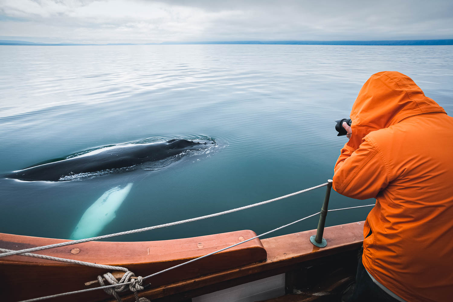The Silent Search: We navigate the nutrient-rich waters of Skjálfandi Bay. Because our boat is silent, the whales are often more relaxed around the vessel. This allows for breathtakingly close (yet respectful) encounters. When a whale surfaces to breathe, the sound of the blow echoing across the quiet bay is a moment of pure magic that stays with you forever.