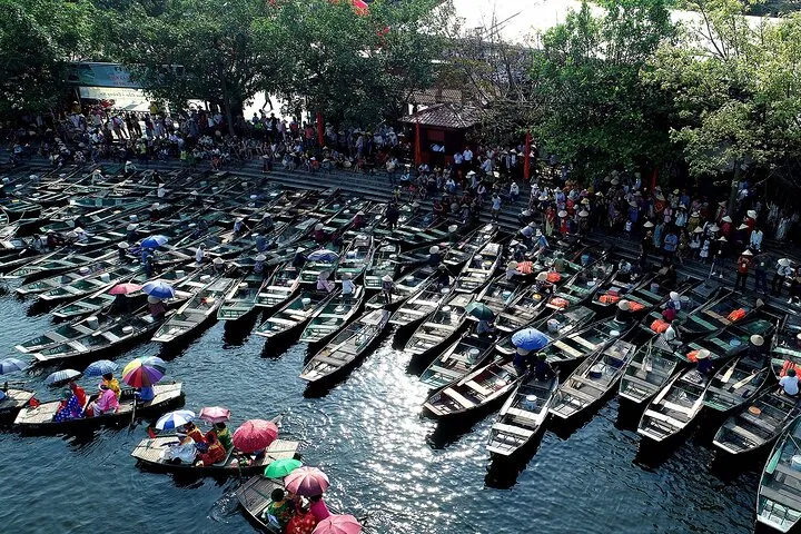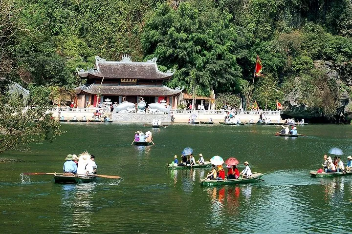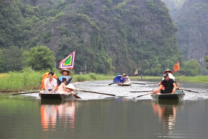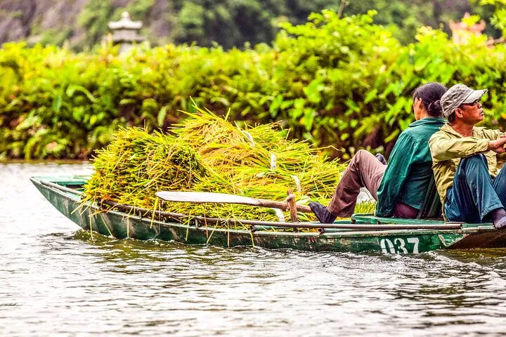 Tam Coc “Three Caves” Cruise Board your private sampan boat. For two hours, you will drift through Hang Ca, Hang Hai, and Hang Ba. Watch as the mountains cast long shadows over the river and the vibrant greenery of the rice fields.