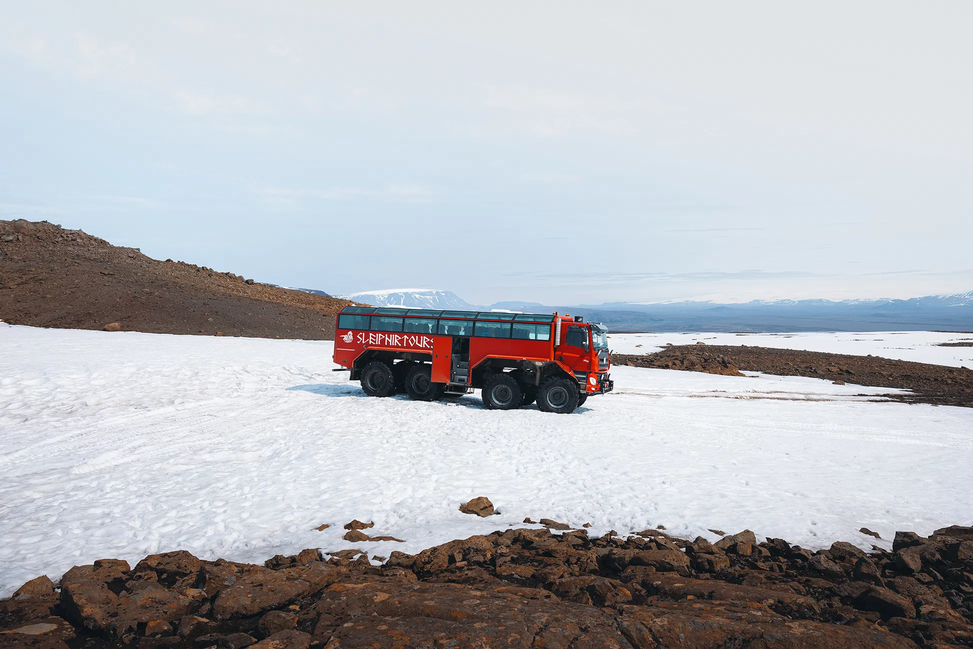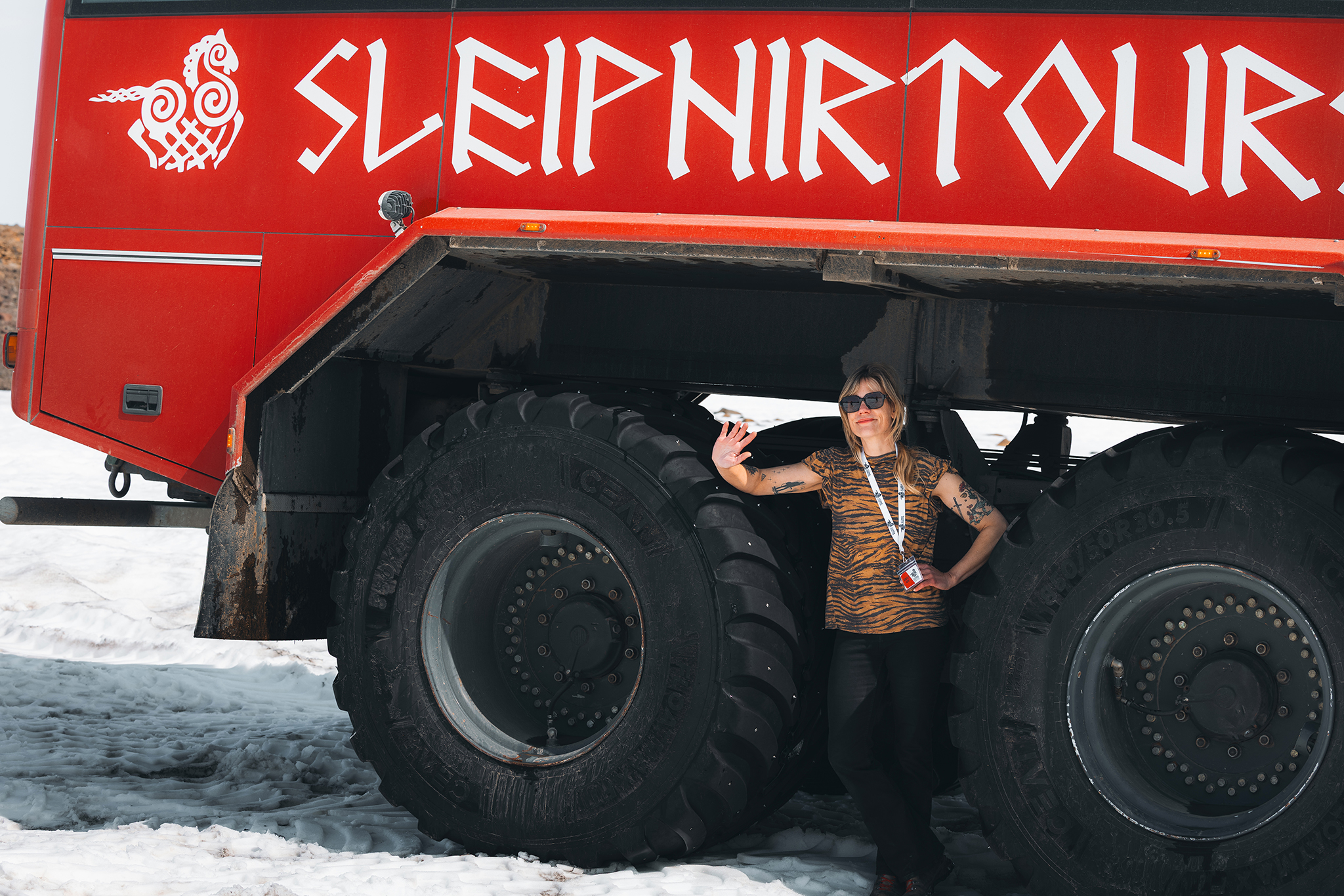 01. Meet the Giant at Gullfoss During summer time we have a transfer bus that brings the guests to Geldingafell where the Truck is located. The transfer bus is clearly marked “Sleipnir Glacier Tours”. The Wheel size varies with our vehicles, and can be 65 inch or 71 inch or 78 inch.